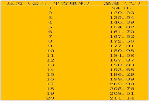 按1MPa=1000kPa=10.2kgf/cm2(公斤/平方厘米),对照饱和蒸汽压力(MPa表示)与蒸汽温度的标准表,可以计算得到饱和蒸汽压力(kgf/cm2表示)与蒸汽温度之间的关系,如下所示: