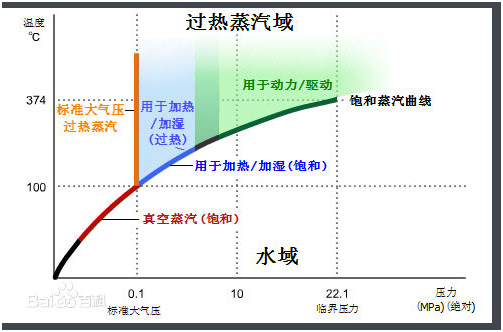 饱和蒸汽在很多行业具有很广的用途。在化工领域,蒸气常被当做热源,气压在0.1 - 5 MPa,温度在110-250℃,一般是饱和蒸汽。在火电和核电领域,蒸汽被用来做驱动涡轮机的驱动力。亚临界发电:气压17MPa,温度540℃,过热蒸汽。超临界发电:气压30MPa,温度为600℃。核电一般用高压饱和蒸汽。在医疗领域,被用于高温消毒,气压0.7MPa,温度160℃,过热蒸汽。,化工厂一般用于化料、加热储罐、加热反应釜,温度一般在120以上。食品高温杀菌,一般在100-150℃,超高温杀菌指加热温度为135~150℃。